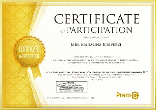 - Madalina Icriverzi, Paula Florian, Trif Mihaela, Ioana Catalina Gifu, Raluca Ianchis, Anca Roseanu, "In vitro montmorillonite clay screening for advanced hybrid material development as chemotherapeutic drug carrier", International Conference On Nanomedicine And Nanobiotechnology – ICONAN 2017, 25-27 September 2017, Barcelona, Spain.