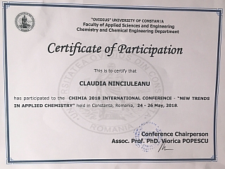 - Ianchis Raluca, Ninciuleanu Claudia, Gifu Catalina, Alexandrescu Elvira, Preda Silviu, Nistor Cristina, Nitu Sabina, Petcu Cristian, "Variation of Salecan Concentration in PMAA-Salecan-Organomodified Clay Nanocomposites", International Conference "Chimia 2018" - New Trends in Applied Chemistry, 22-24 May 2018, Constanta, Romania.