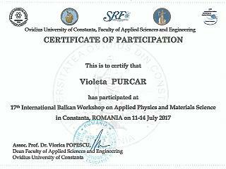 - V. Purcar, R. Somoghi, S.G. Nitu, C.A. Nicolae, E. Alexandrescu, V. Raditoiu, S. Caprarescu, "Sol-gel preparation of modified ZnO materials", 17th International Balkan Workshop on Applied Physics, Constanta, Romania, 11-14 iulie 2017.