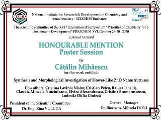 - C. Mihaescu, C.L. Nistor, C. Petcu, R. Ianchis, C.M. Ninciuleanu, E. Alexandrescu, C. Scomoroscenco, L.O. Cinteza, "Synthesis and Morphological Investigation of Flower-Like ZnO Nanostructures", Priorities of Chemistry for a Sustainable Development - PRIOCHEM XVI ed., Bucharest, Romania, 28-30 October (2020).